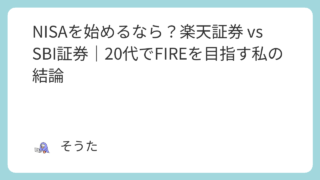 NISA NISAを始めるなら?楽天証券 vs SBI証券|20代でFIREを目指す私の結論 「NISA始めたいけど、楽天証券とSBI証券どっちがいいの?」こんな方にむけて。こんにちは。投資歴5年、社会人2年目の私が解説します。 私は両方の口座を実際に使い分けていますが、結論は以下のとおりです。▶︎「投資信託」の積立だけ:楽天証券▶... 2026.02.22 NISA